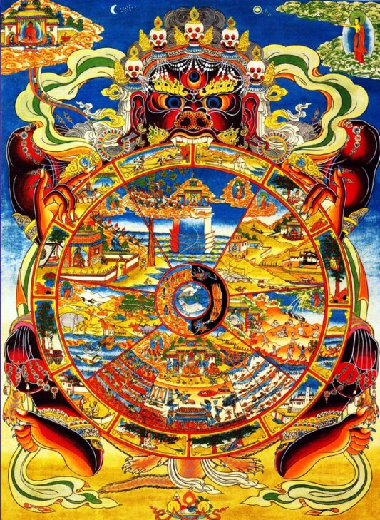 Il Buddhismo Tibetano, come supporto visivo all'insegnamento di base, così dipinge la Ruota dell'esistenza: