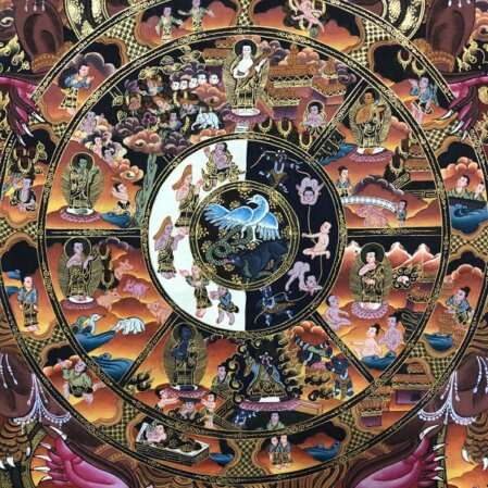 L'intera ruota è raffigurata saldamente stretta dagli artigli di Yama, il Signore della Morte che tutto divora e ci ricorda l'impermanenza delle cose.